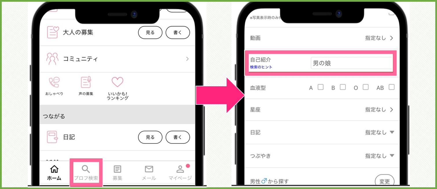 ワクワクメールのプロフ検索を利用すれば、男の娘や女装子を探せます。自己紹介の欄に「男の娘」や「女装」と入力したら、検索条件に適した相手が表示されます。