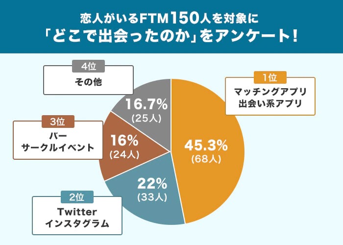 マッチングプラスが、トランスジェンダーのFtM(Female to Male)を対象におこなったアンケートによると、約7割がアプリやSNSを使って出会っていることがわかりました。